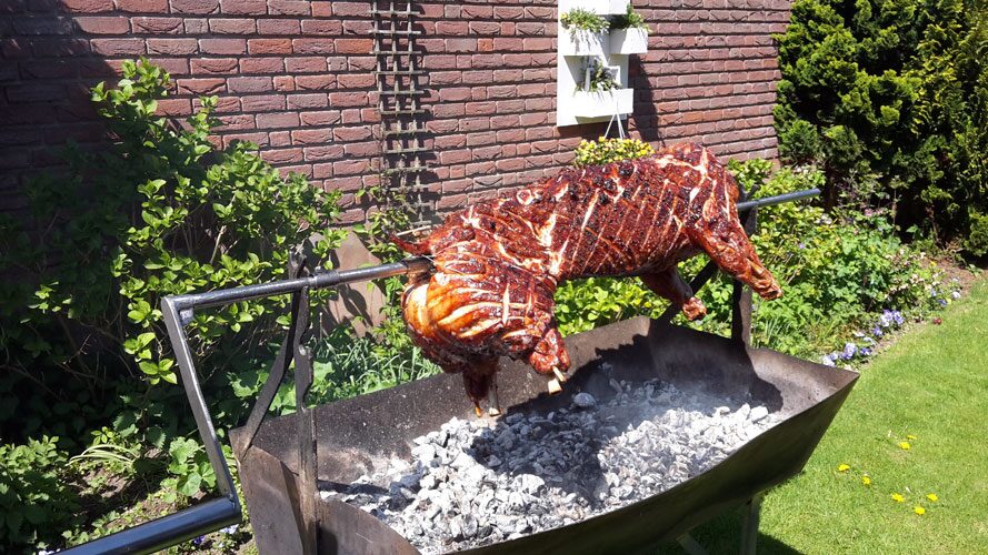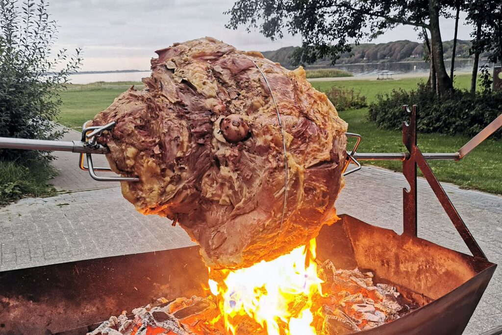 Spanferkel vom Spieß, bei Ihnen vor Ort über Holzkohle gegrillt und für Ihre Gäste tranchiert.